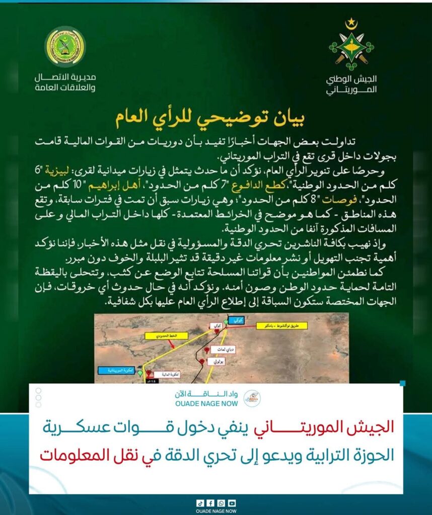 أكد الجيش الوطني الموريتاني أن ما تم تداوله بشأن تحركات عسكرية داخل بعض القرى الحدودية يتعلق بدوريات ميدانية اعتيادية.